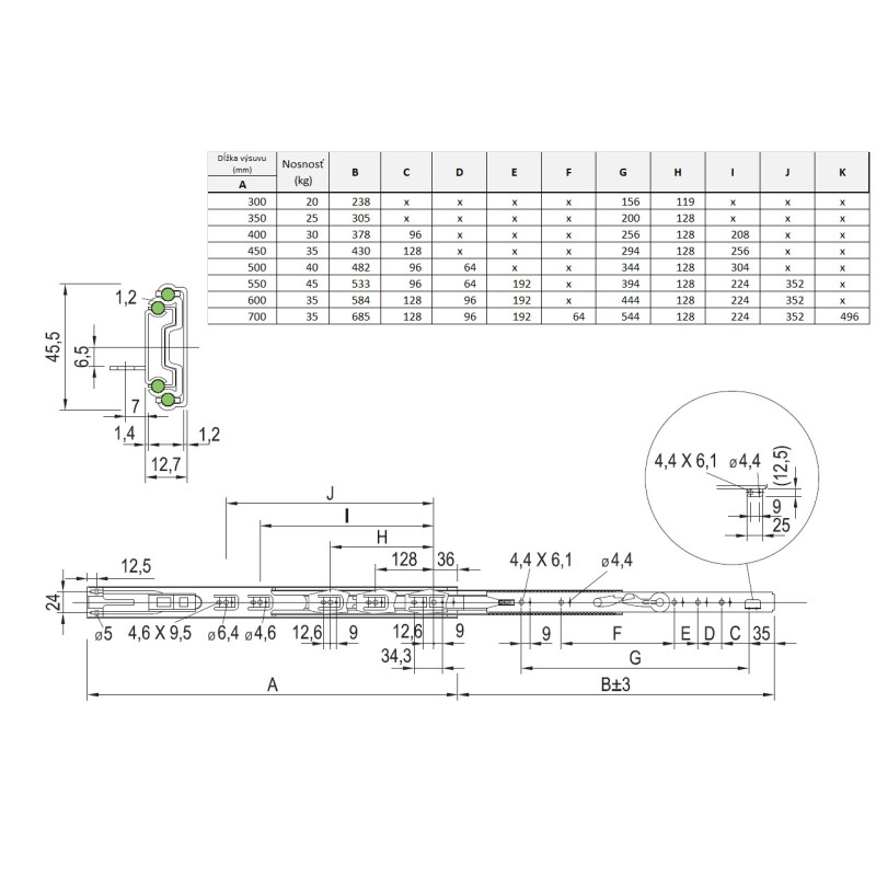 Guličkový plnovýsuv s tlmením a nosnosťou 30kg.