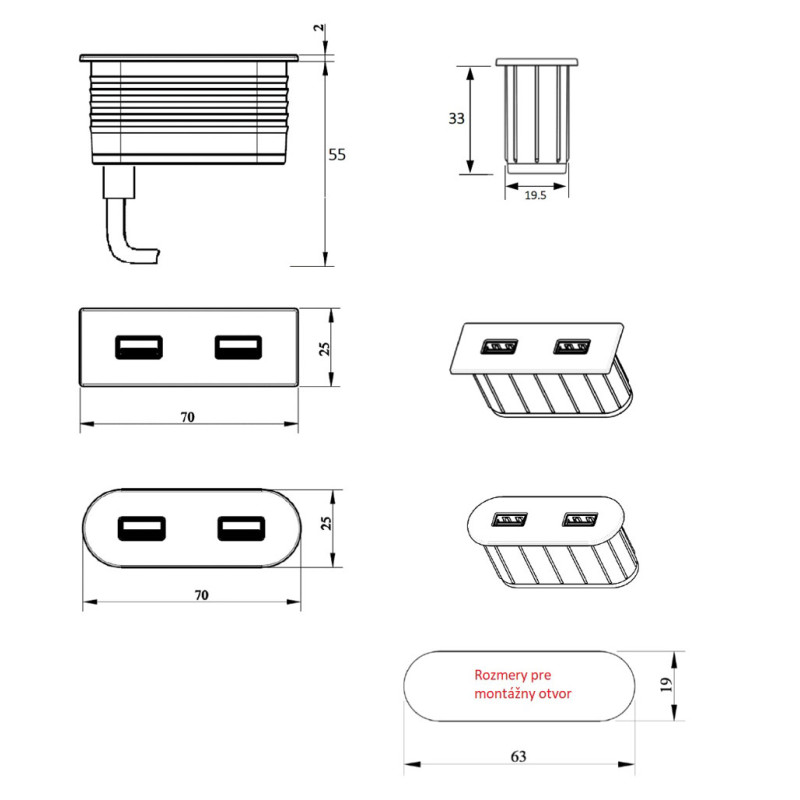 Dizajnová USB nabíjačka s kovovým telom, ktorú je možné elegante umiestniť čalúnenom aj drevenom nábytku. Vďaka malým rozmerom (hĺbka iba 33mm) umožňuje inštaláciu napr. do pracovnej dosky alebo hrany dosky. Sada obsahuje: USB nabíjačku, 2m kábel a ada