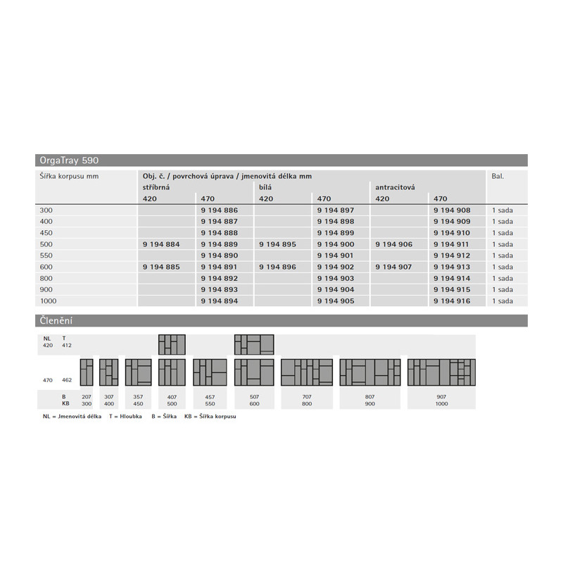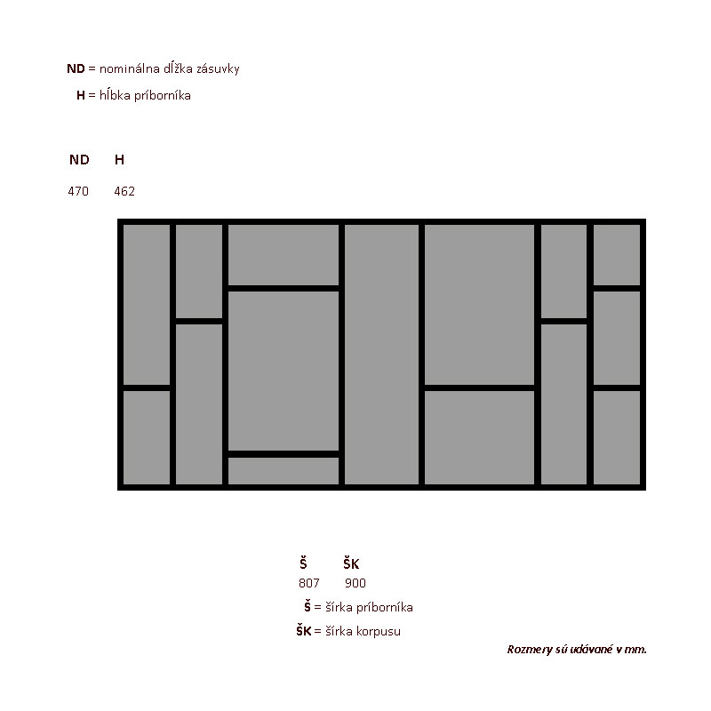 Príborník vysokej kvality od nemeckej firmy Hettich. Určené pre korpusy štandardnej šírky. Množstvo deliacich prvkov ktoré sú súčasťou, sa líši podľa šírky. Materiál: plast